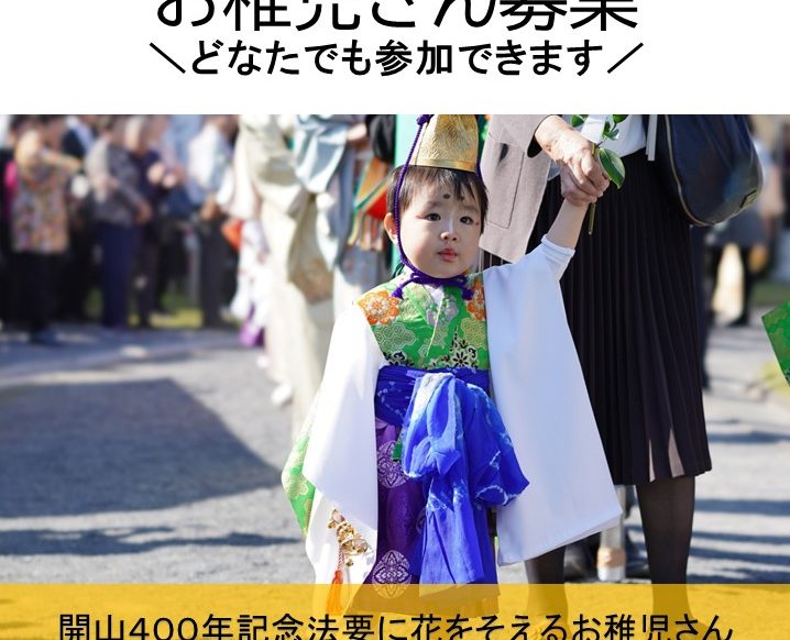 こんにちは 正授院では、開山四百年記念行事にあわせて「稚児行列(ちごぎょうれつ)」を行います。 稚児行列とは、お子さまたちが華やかな伝統衣装を身にまとい、お寺まで歩く伝統行事です。 400年記念祭の詳細は...